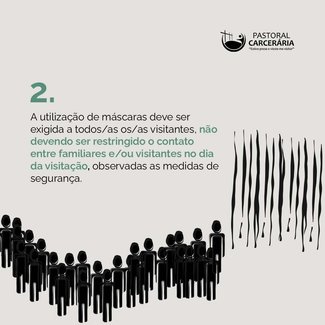 “Deve ser exigido que todos/as os/as visitantes utilizem máscaras ao entrarem na unidade prisional e na unidade socioeducativa não devendo ser restringido, no dia da visitação, o contato entre familiares e/ou visitantes, observadas as medidas de segurança como o uso de máscaras adequadas e a vacinação das pessoas privadas de liberdade, seus familiares e amigos/as, além dos/as funcionários/as das unidades prisionais e socioeducativas.”