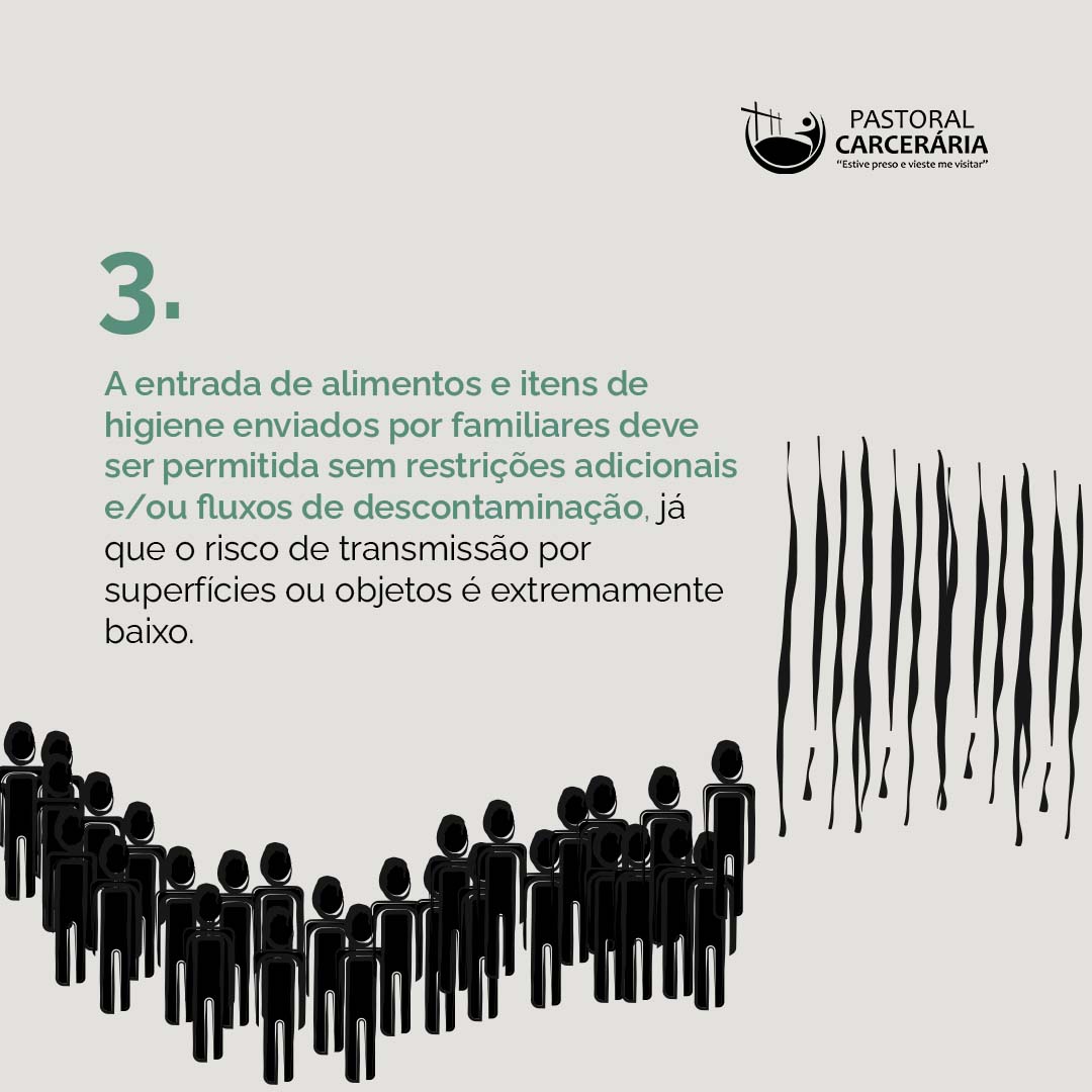 “Deve ser permitida a entrada de alimentos e itens de higiene enviados pelos familiares das pessoas privadas de liberdade, sem restrições adicionais e/ou fluxos de descontaminação, uma vez que o risco de transmissão por superfícies ou objetos é extremamente baixo. Ademais, o consumo de maior quantidade e diversidade de nutrientes pelas pessoas em privação de liberdade, a partir da recepção dos alimentos enviados ou entregues por familiares e amigos/as, tem o potencial de melhorar as condições de saúde das pessoas privadas de liberdade, considerando situações de insuficiência e monotonia alimentar.”