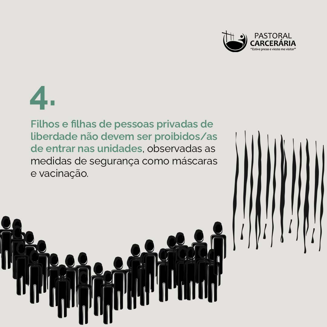 “Filhos e filhas de pessoas privadas de liberdade não devem ser proibidos/as de entrar nas unidades prisionais e socioeducativas nas visitas, observados as medidas de segurança como uso de máscaras adequadas e vacinação das pessoas privadas de liberdade e de funcionários/as.”