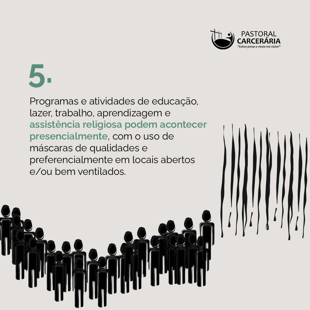 “Programas e atividades de educação, lazer, trabalho, aprendizagem e assistência religiosa podem ocorrer presencialmente, desde que as pessoas estejam usando máscaras de qualidade, e as atividades ocorram preferencialmente em locais abertos e/ou bem ventilados. As mesmas regras valem para os atendimentos realizados pelas equipes técnicas das unidades, tais como atendimento psicológico, social etc.”