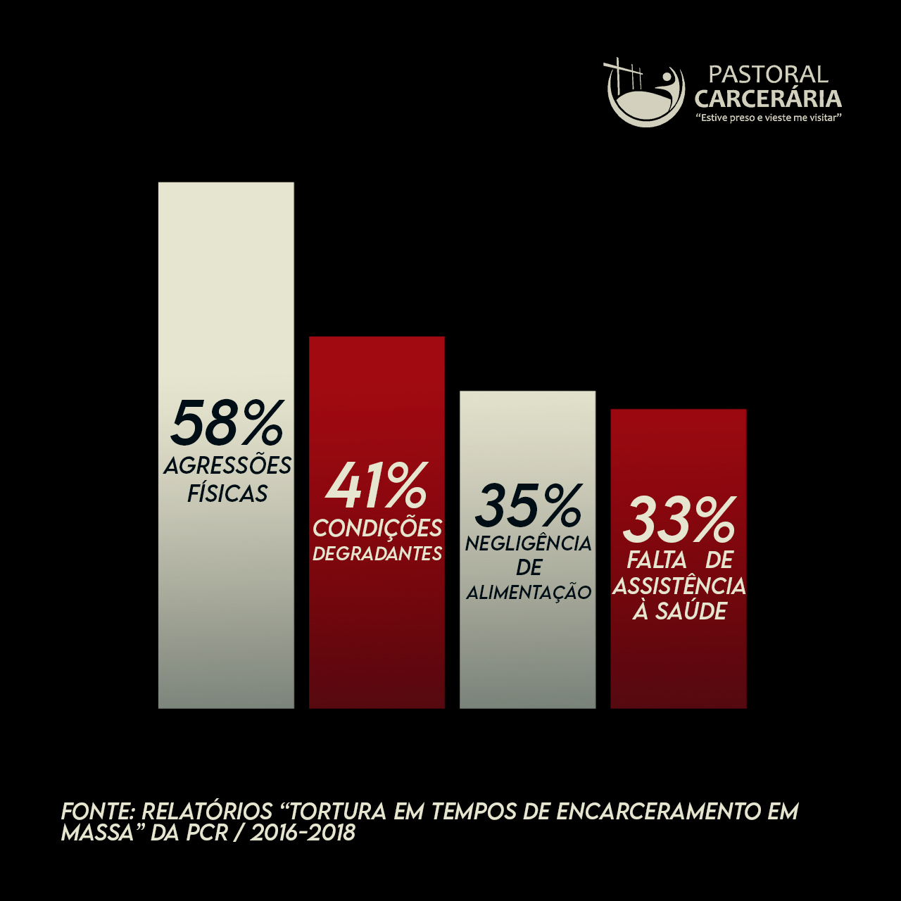 Mas é importante pontuar que a tortura não é só o ato de violência. A falta de assistências básicas, superlotação e muitos outros fatores implicam uma rotina de dor constante: prova disso é que as agressões físicas registradas nos relatórios pela Pastoral Carcerária Nacional correspondem a 58% dos casos. 41% das denúncias revelam as condições degradantes do cárcere, como por exemplo a insalubridade das celas e de outros espaços das prisões; 35% delas falam da negligência de alimentação, vestuário, produtos de higiene e roupas de cama. Além disso, 33% relataram a falta de assistência à saúde.