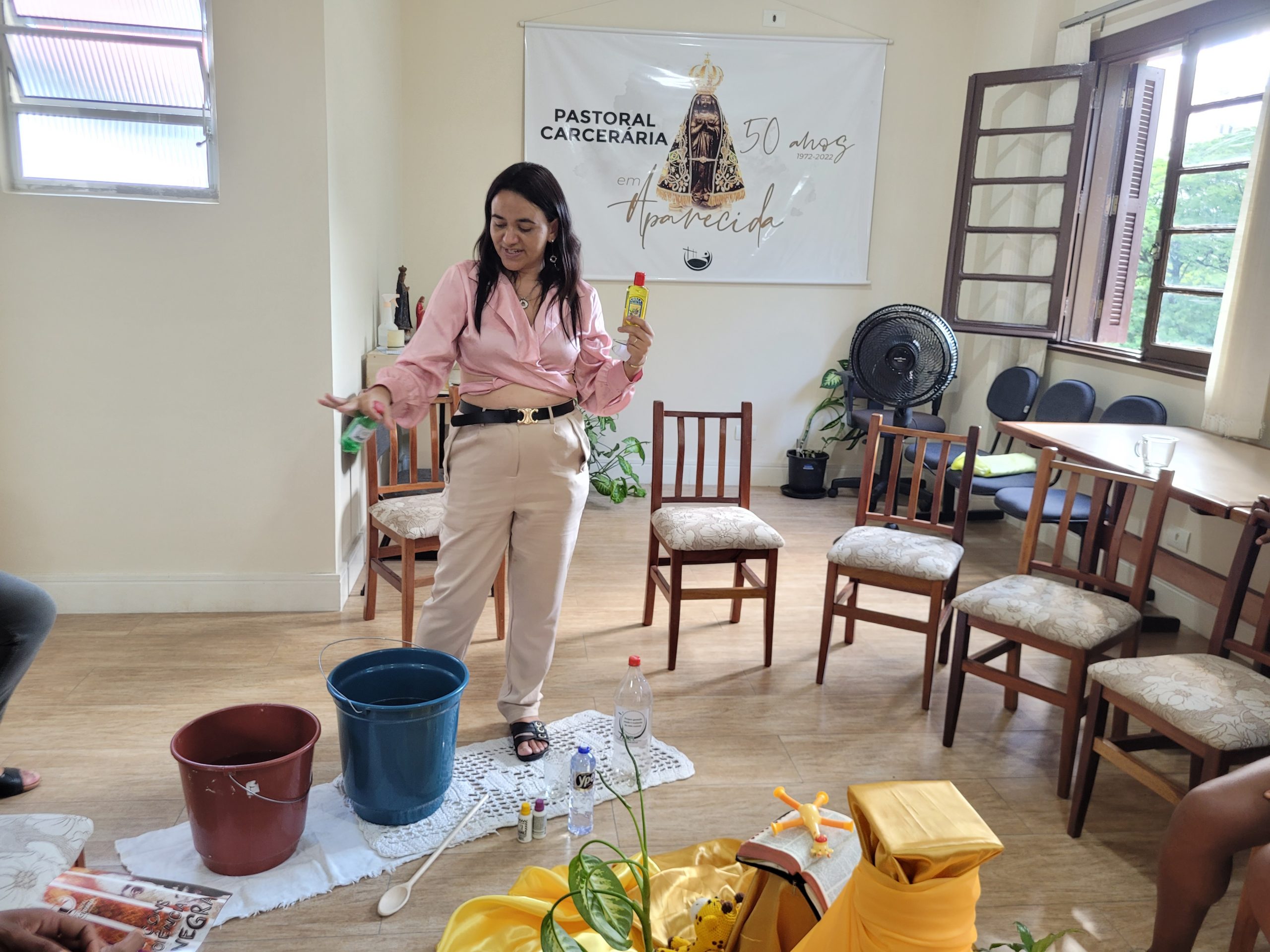 Ao final, ocorreu uma breve confraternização, e as sobreviventes presentes levaram um pouco do desinfetante que foi produzido para suas casas.