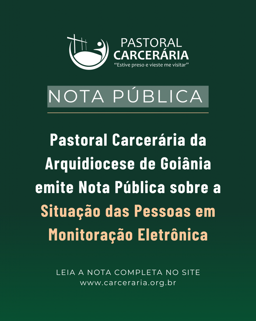A Pastoral Carcerária da Arquidiocese de Goiânia, fiel à sua missão de promover a dignidade humana e a justiça social, vem manifestar preocupação sobre pessoas em monitoração eletrônica e reafirmar seu compromisso com a defesa da vida e da inclusão social.